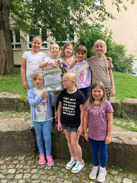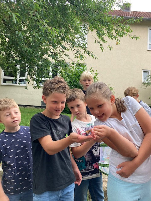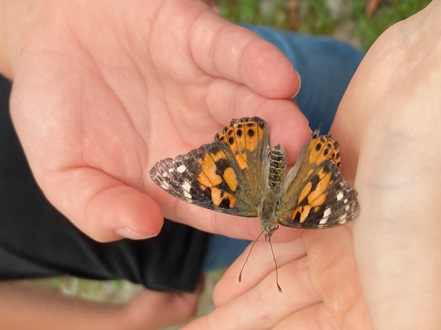 Nach den tierisch unvergesslichen Erlebnistagen im Klassenzimmer mussten wir uns nun auf den Abschied von unseren lieb gewonnenen Distelfaltern vorbereiten. Gemeinsam ging es am 27. Juni 2025 mit den Volieren in die Natur, wo vorsichtig der Volierendeckel geöffnet wurde. Alle Kinder waren darauf eingestellt, dass die Schmetterlinge sofort in die Freiheit fliegen wollen, jedoch bewiesen sie ganz das Gegenteil und waren handzahm. Damit hatte wirklich niemand gerechnet. Die Schmetterlinge ließen sich außerordentlich viel Zeit bis zu ihrem Abflug in die Freiheit. Jedes Kind hatte einen Schmetterling auf der Hand oder einem Finger und konnte ihn behutsam weitergeben. Magische Momente machten sich breit… Glückselige Kindergesichter… Und ausreichend Zeit, sich in aller Ruhe zu verabschieden, eine gute Reise zu wünschen und sie beim Fliegen auf dem Schulgelände zu bewundern.