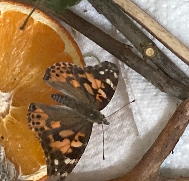 Nach knapp 14 Tagen nahte der Tag des Schlupfes, den wir tatsächlich bei einzelnen Puppen live miterleben konnten. Selbst unsere frisch geschlüpften Küken waren live dabei ;-) Durch das angelesene Wissen als Forscher und Entdecker wussten die Kinder, dass man den Zeitpunkt des Schlupfes daran erkennt, dass die Puppen sich dunkel verfärben. Kurz vor dem Schlupf waren sogar durch die Puppenhülle hindurch schon die Farben des Schmetterlings zu erkennen. Als die Schmetterlinge geschlüpft sind, blieben sie erst einmal eine Weile an der Volierenwand hängen, um ihre Flügel „aufzupumpen“ (der Schmetterling pumpt Flüssigkeit in seine Flügeladern). Nach 1-2 Stunden hatten die Flügel ihre vollständige Größe erreicht und waren steif genug zum Fliegen. Mit Begeisterung konnten die ersten Flugversuche in der Voliere beobachtet werden und Glücksgefühle machten sich breit, dass es einige Raupen geschafft hatten, sich in einen zauberhaften, bunten Schmetterling zu verwandeln. Jetzt wurden die Volieren liebevoll gestaltet mit Blüten, Ästen, Blättern und winzig kleinen Kieselsteinen. Täglich benötigen die Schmetterlinge nun Futter. Die Kinder setzten zudem eine Zuckerlösung an, mit der kleine Miniatur-Blütenschwämme getränkt und bei Bedarf auch einige Blüten benetzt wurden. Außerdem mögen die Schmetterlinge besonders gerne aufgeschnittene Orangen und überreife Bananen. Aus nächster Nähe konnten die Kinder die Schönheit der Schmetterlinge bewundern und täglich beobachten, wie sie fressen. Erst riechen die Schmetterlinge mit ihren Fühlern an der Nahrung, dann probieren sie sie mit ihren pelzbewachsenen Vorderbeinen. Die Schmetterlinge haben sogar einen Rüssel, den sie beim Trinken des Zuckerwassers ausrollen und anschließend wieder einrollen.