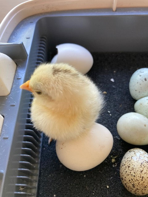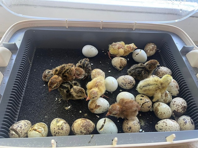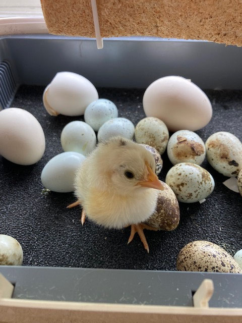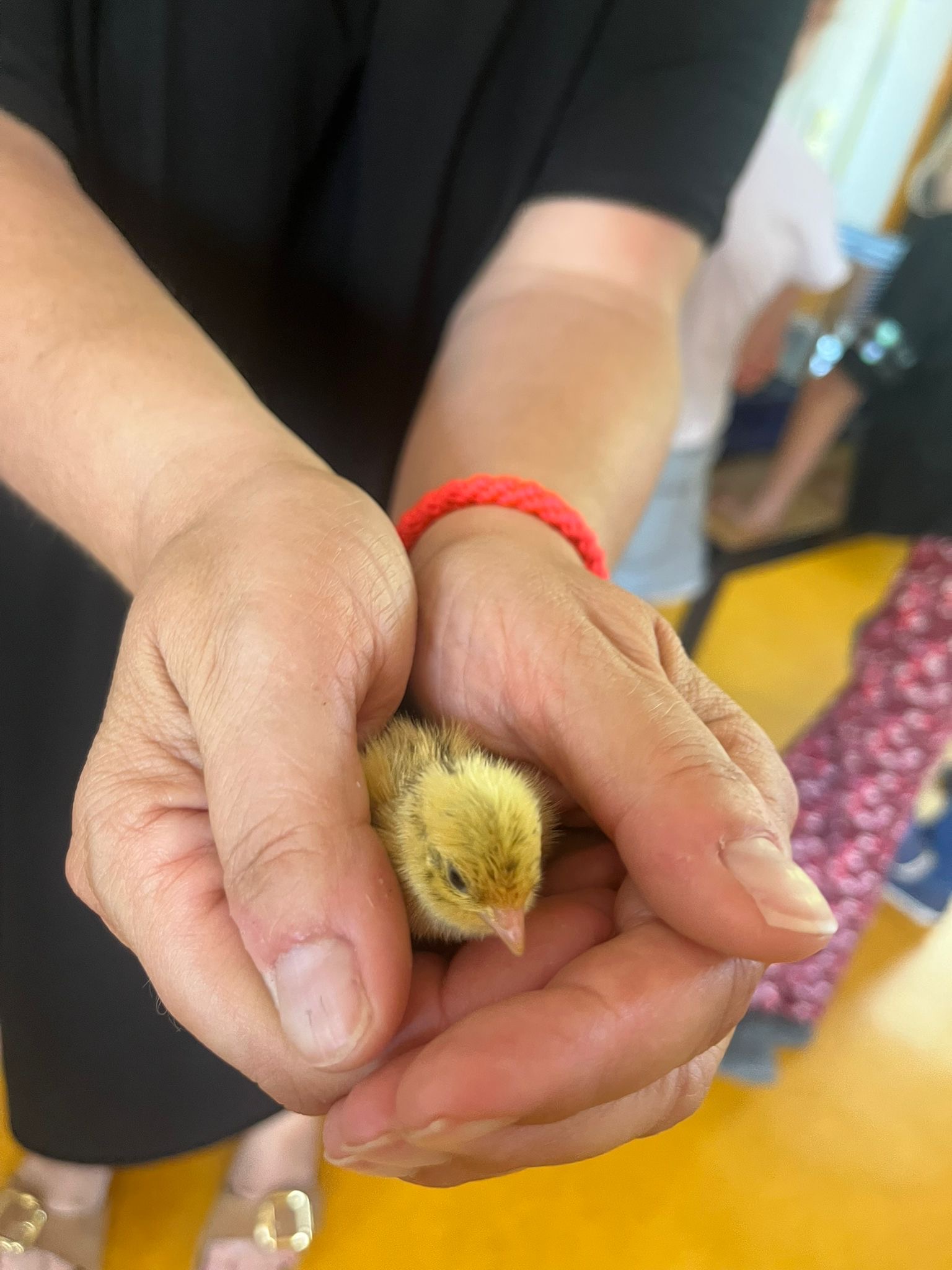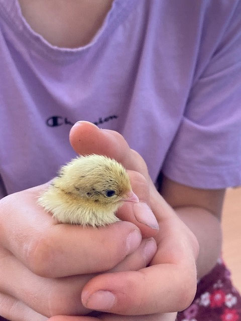 Schon bald ging es in die 2. Runde in der 2a. Frau Hauptmann brachte uns erneut Eier und legte sie im Brüter ein. Die Freude unbeschreiblich, als um den 21. Tag herum am 23. Juni 2025 erlebbar wurde, dass das erste Küken bereit ist zum Schlupf und von innen an die Schale klopfte, um „Hallo“ zu sagen. Von nun an wurde es von Stunde zu Stunde lebendiger im Klassenraum. Am Tag darauf schlüpften weitere Küken. Kein Küken glich dem anderen. Nun wurden alle Küken in ihr größeres Zuhause mit Wärmeplatte umgesetzt und lernten von den Kindern durch Fingertippen am Boden, wie man trinkt und fleißig Körnchen pickt. Es war für alle faszinierend mit anzusehen, wie schnell Embryo und später Küken heranwachsen und bald in der Lage sind, ihre Umgebung wahrzunehmen. Vor allem nahmen die kleinen Küken schnell unser Klassenzimmer wahr und starteten erste Flugversuche. Die Sommerferien standen bevor und so wurde es nun auch höchste Zeit, dass sie in einen richtigen Hühnerstall umziehen dürfen. Der Abschied fiel den Kindern nicht leicht, aber ein Wiedersehen ist geplant!