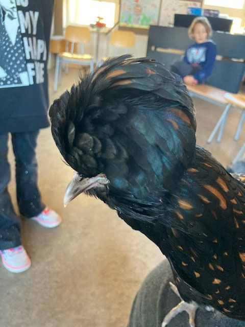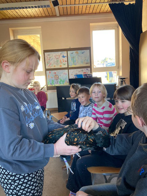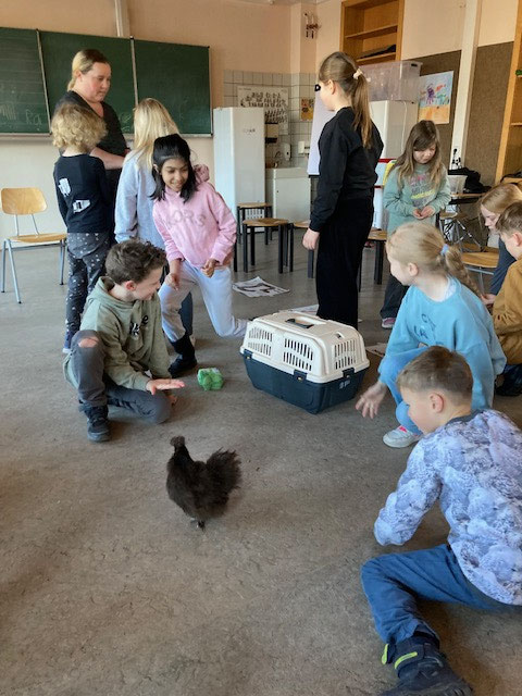 Nun war Abwarten angesagt. 21 Tage – Vom Ei zum Zwergseidenhuhn-Küken. Am 3. Tag besuchte uns Frau Hauptmann, um mit einer Schierlampe mit uns zu schauen, ob erste Blutgefäße durch die Eierschale hindurch zu erkennen sind und somit Leben im Ei heranwächst. Das erste Schieren war ernüchternd, da noch kein Leben zu erkennen war. Frau Hauptmann kam nicht nur mit der Schierlampe in die Schule, sondern sorgte zudem für eine federleichte Stunde mit zwei Unterrichtsbesuchern. Ein wunderschönes Paduana-Huhn mit einem kunstvollen Gefieder besuchte die 2a sowie auch ein wunderschön ausgewachsenes wuscheliges Zwergseiden-Huhn. Die Freude war groß und die beiden Hühner fühlten sich zwischen den Kindern sichtlich wohl. Frau Hauptmann erklärte den Kindern viel zur Pflege und Haltung von Hühnern.