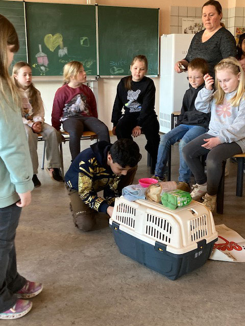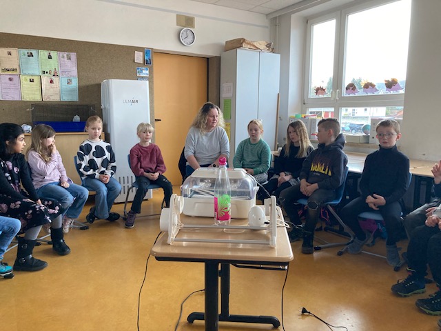 Die Vorfreude und Gespanntheit auf das Küken-Projekt startete bereits zu Beginn des 2. Schulhalbjahres. Anfang März ging es dann endlich los. Nachdem die Kinder schon im Sachunterricht in die Thematik eingeführt wurden und wir jede Menge Vorwissen sammelten, konnten zudem Stella und Miko aus eigenen Erfahrungen der Hühnerhaltung berichten. Am 4. März 2025 war es dann soweit. Stellas Mama kam zu uns ins Klassenzimmer mit allem Zubehör, was nun nötig war. Frau Hauptmann erklärte den Kindern, was uns nun in den kommenden Wochen erwartet und legte die Eier in den Brüter ein.