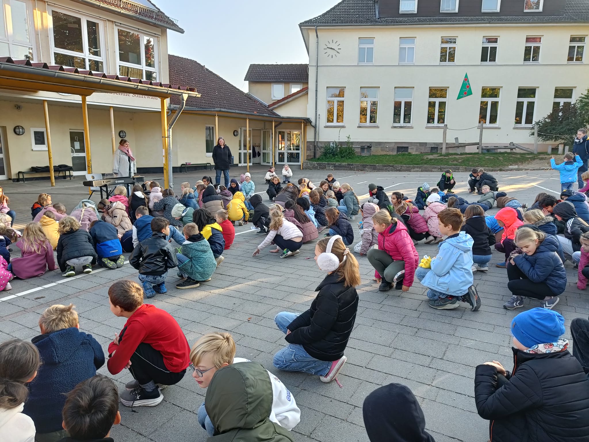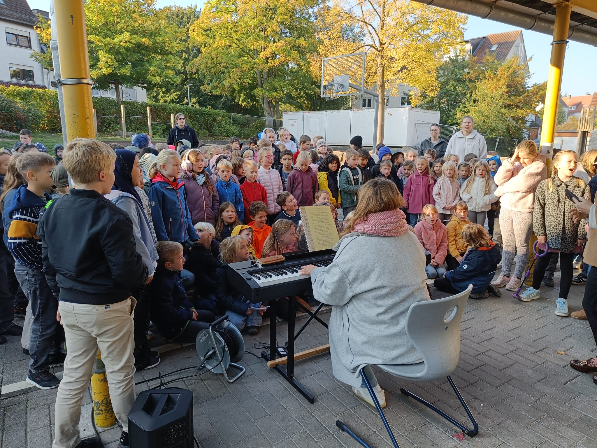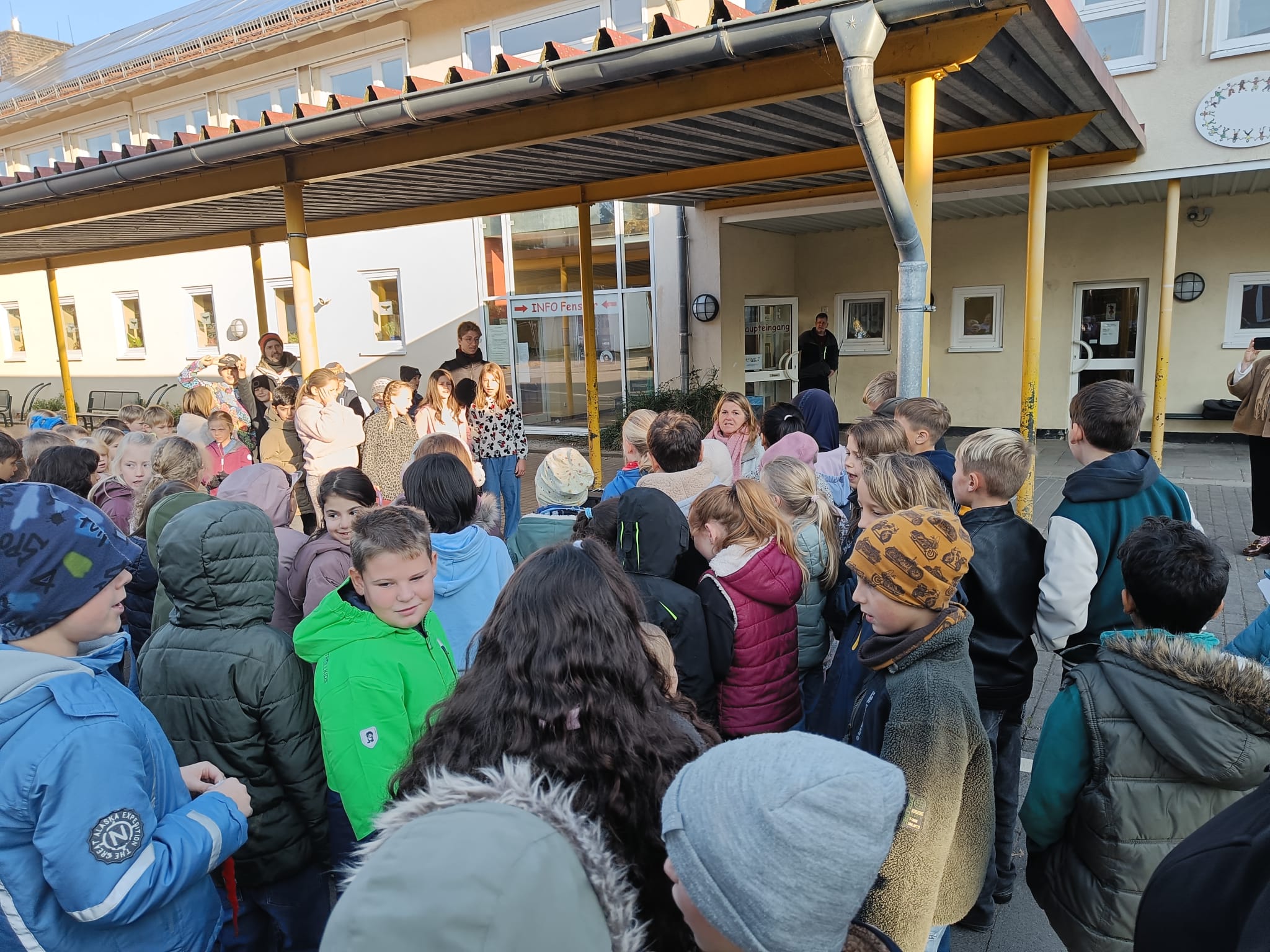 Mit dem Lied „Ich lieb`die Herbstzeit“ stimmten sich alle Schülerinnen, Schüler, Lehrerinnen und Lehrer auf dem Schulhof bei strahlendem Sonnenschein und frischen Temperaturen auf die letzte Schulstunde und die bevorstehenden Herbstferien ein. Besonders unsere neuen Klassen 1a und 1b waren Tage zuvor schon fröhlich aufgeregt und in großer Vorfreude bezüglich ihres ersten gemeinsamen Singens auf dem Schulhof.